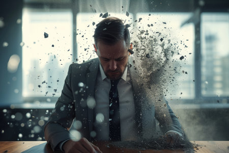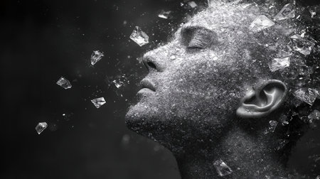 A figure stands solemnly in a softly illuminated environment, where his silhouette begins to disintegrate into countless shards. The artwork captures a powerful representation of the struggle between identity and transformation, evoking deep emotional resonance through its unique visual effects and muted tones.