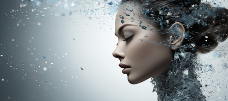 Abstract Woman Profile with Shattered Particles, Futuristic Design on Blue Background.