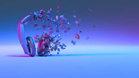 camera in purple neon lighting crumbled into small parts, 3d illustration