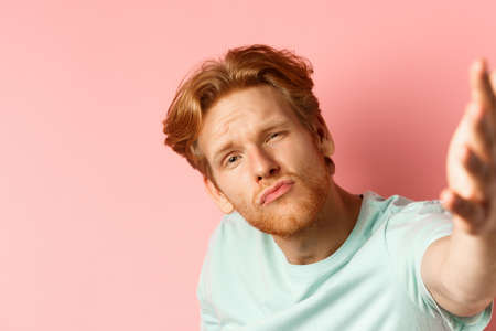 Funny young man with red messy hair taking selife with puckered lips and macho expression, view from smartphone camera, standing over pink background