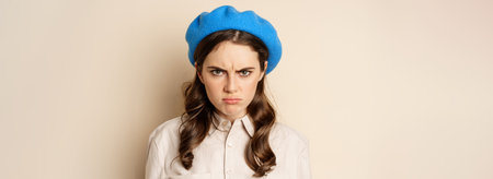 Close up portrait of young beautiful woman sulking, looking angry and disappointed, grimacing displeased, standing over beige background