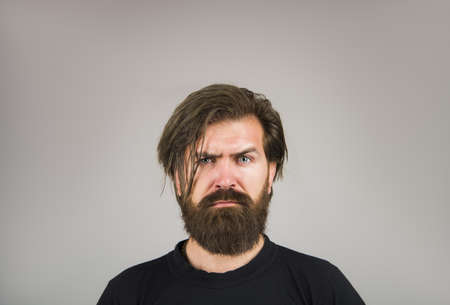 Portrait of adult bearded man with emotion of saddness on face looking at camera