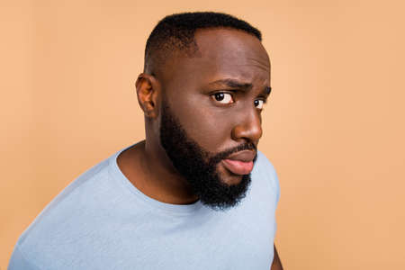 Photo of sad young brunet guy look camera wear blue t-shirt isolated on beige color background