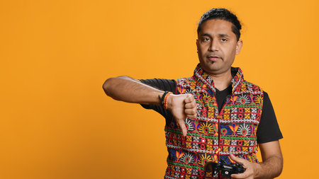 Upset man showing thumbs down sign gesturing holding controller, disapproving of videogames. Displeased indian person against gaming, doing rejection hand gesture, studio background, camera A
