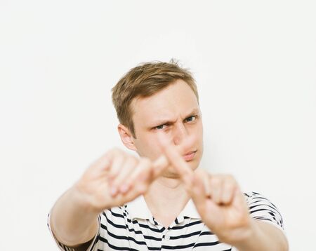 Protesting gesture. Dissatisfied man. No way. Disappointed guy holding forbidden hand up expressing displeased emotion isolated blue copy space.