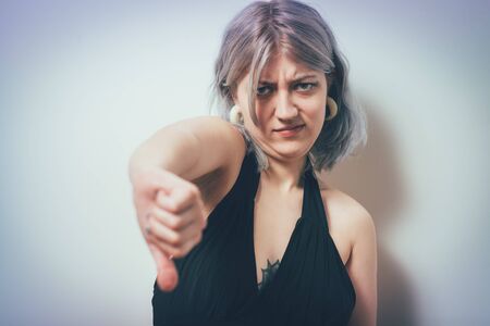Furious woman on violet background. Lady in stress and rage, she threatens with aggression and looking at camera.