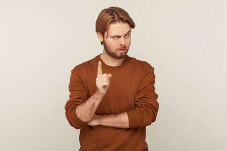 White ginger man with beard frowning and showing stop gesture isolated over grey background