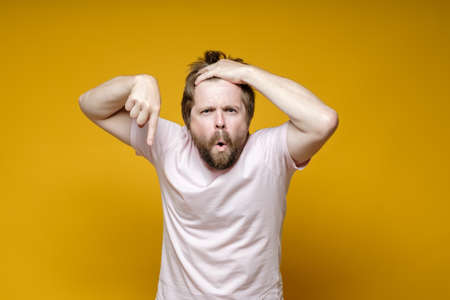 Disgruntled, strange man points down with index finger, holds his hair with hands and looks seriously while saying something.