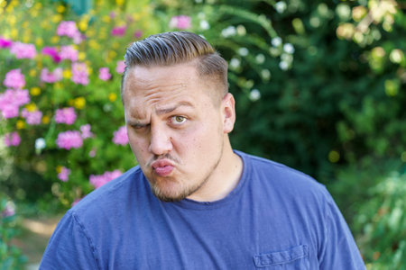 Young man showing total disbelief and scepticism as he raises an eyebrow at the camera outdoors in a garden