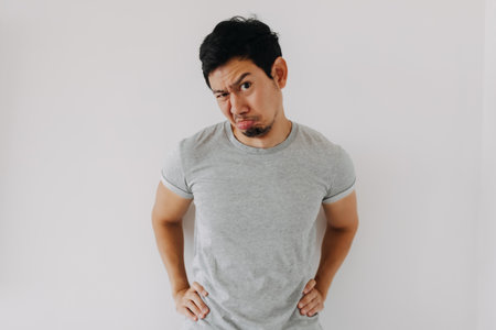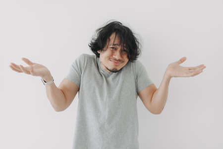 Helpless and hopeless face of Asian man can not solve problem on grey t-shirt.