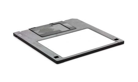 Floppy disk from black plastic isolated on white background. Outdated technology. Data storage diskette.