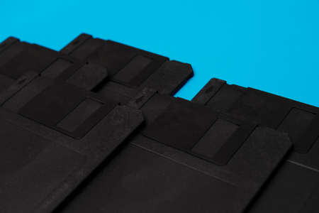 Black and colored floppy disks on blue background. Computer technology 80s.