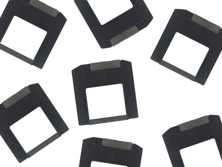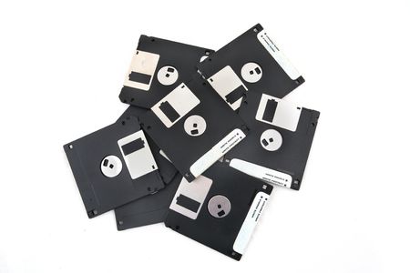 Whole plane with white background of stack of colored floppy disks, grey, black and blue.