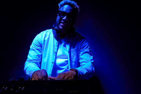 African American stylish dj creates music on a blue foggy background. Smiling dark-skinned musician behind a dj remote in headphones keeps track of time and listeners in a club