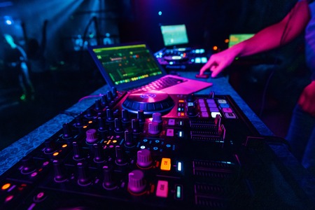 DJ mixer in a nightclub with glowing colored lights from controllers and buttons