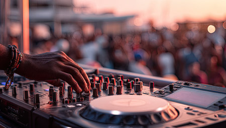 A DJ is seen manipulating a turntable and mixing console during an event. The close-up view highlights the hands interacting with the equipment. The scene features warm tones and a shallow depth of field, with a blurred crowd in the background. The image could be used for various commercial or editorial purposes.