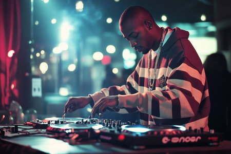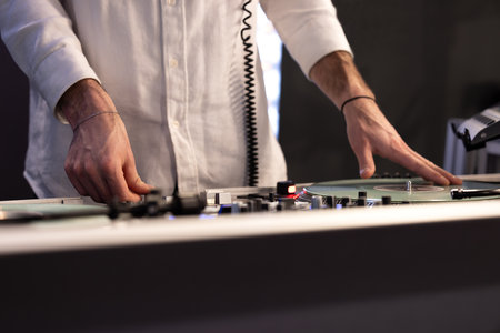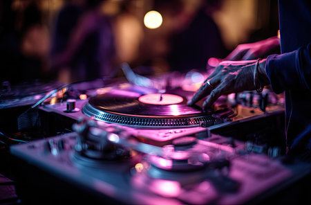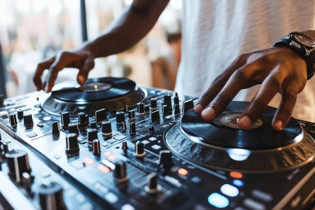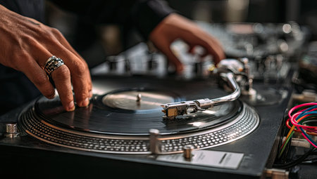 A close-up view depicts a DJ manipulating a turntable, the hands prominently featured. The composition showcases the turntable and vinyl record. The lighting emphasizes the equipment with a shallow depth of field. This image is suitable for various editorial and commercial applications.
