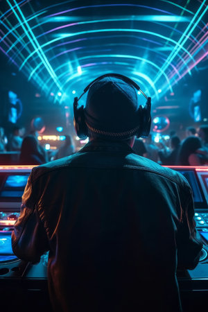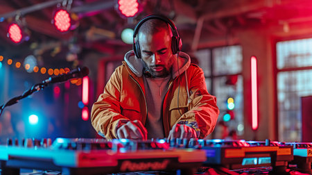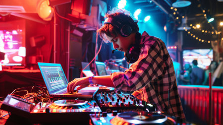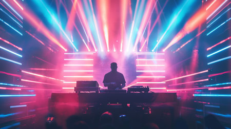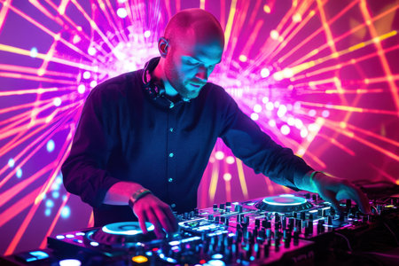 A DJ focused on mixing tracks while colorful lights create a dynamic and engaging backdrop at a nightlife event.