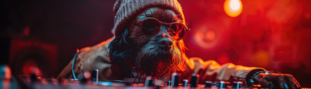 Hip DJ dog with a beanie and sunglasses, mixing beats in a smoky, redlit room