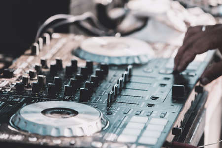 DJ plays music on professional music equipment controller mixer