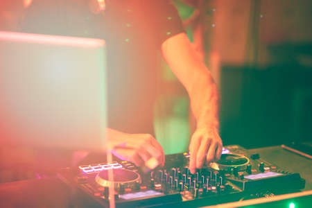 Dj mixes the track in nightclub at party.