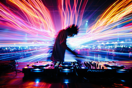 A dynamic shot of a DJ mixing music on stage, with colorful light trails from the turntables