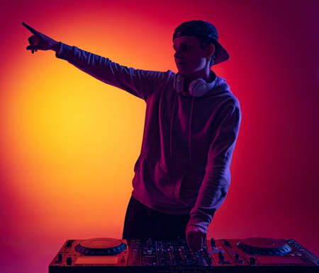 Portrait of young man, dj playing music with special mixer at nightclub, making party isolated over gradient red yellow background in neon