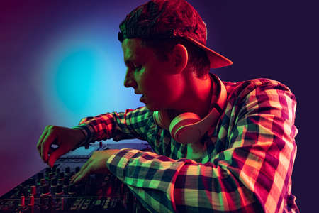 Portrait of young boy in casual cloth, party dj making music with professional sound mixer isolated over purple background in neon light