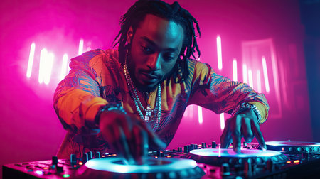 DJ skillfully spinning records with neon lights illuminating the atmosphere