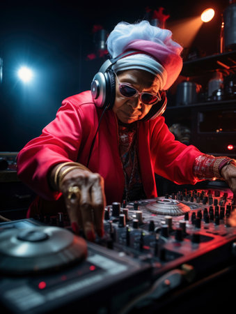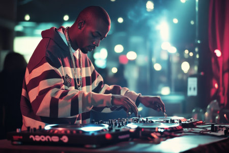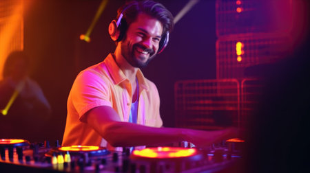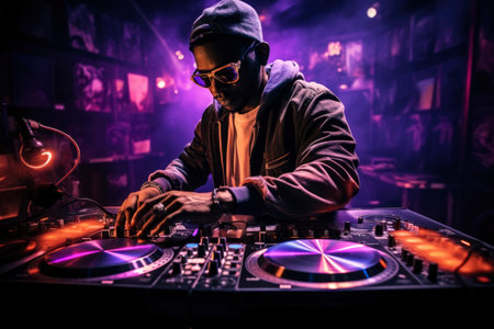 DJ player audio mixing electronic music in a nightclub party Created with Generative AI technology.