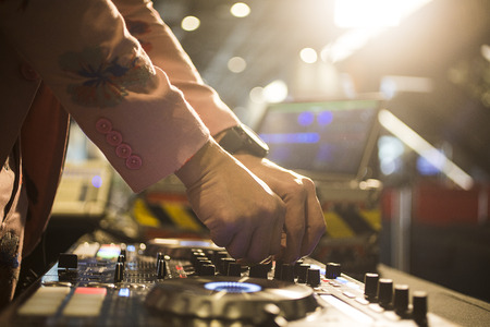 DJ Hands creating and regulating music on dj console mixer in concert nightclub stage