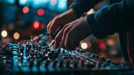 A close-up view of hands adjusting audio equipment in a dimly lit studio. The scene captures the artistry behind sound production with vibrant ambient lights.