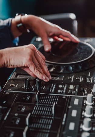Close up of dj control panel playing party music on modern player in disco club. Nightlife and entertainment concept. Defocused background with shallow depth of field and focus on buttons near mixing hand. Spinning, Mixing, and Scratching in a Night Club