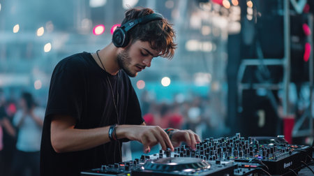A DJ is focused on mixing music in a lively urban setting filled with colorful lights and a crowd.