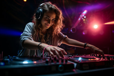 European female disc jockey working at controller, professional dj doing a live performance in a nightclub with red and blue lights nightlife, party concept