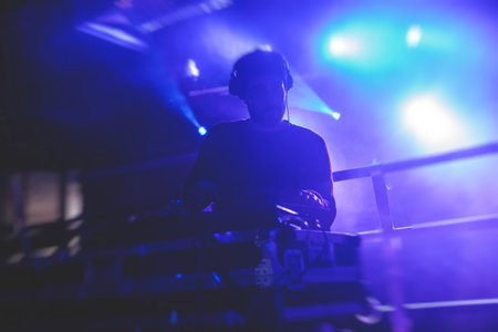 dj with headphones in nightclub party scene, toned image