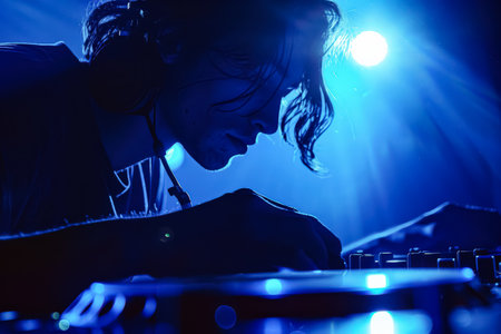 Man is playing a DJ set in a dark room with blue lights. He is wearing headphones and he is focused on his music