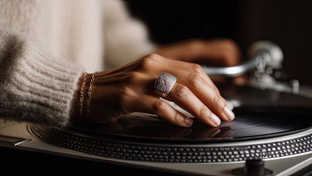 A hand wearing a ring and bracelet rests on a vinyl record player, creating music. The image focuses on the hand and turntable, with soft lighting and a blurred background. The composition suggests a studio or indoor environment with commercial potential for audio, music, and lifestyle projects.