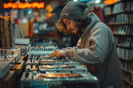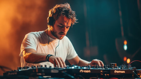 A DJ is seen manipulating a turntable and mixing console during an event. The close-up view highlights the hands interacting with the equipment. The scene features warm tones and a shallow depth of field, with a blurred crowd in the background. The image could be used for various commercial or editorial purposes.