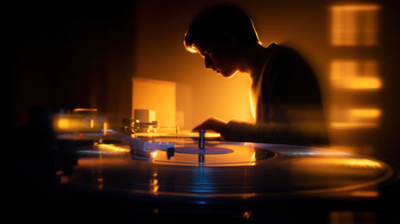 A close-up view depicts a DJ manipulating a turntable, the hands prominently featured. The composition showcases the turntable and vinyl record. The lighting emphasizes the equipment with a shallow depth of field. This image is suitable for various editorial and commercial applications.