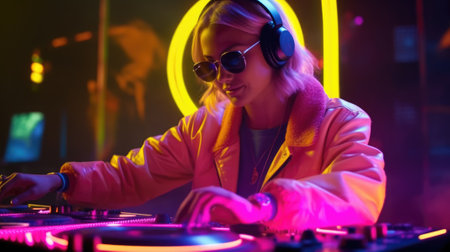DJ skillfully spinning records with neon lights illuminating the atmosphere