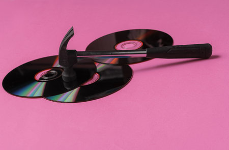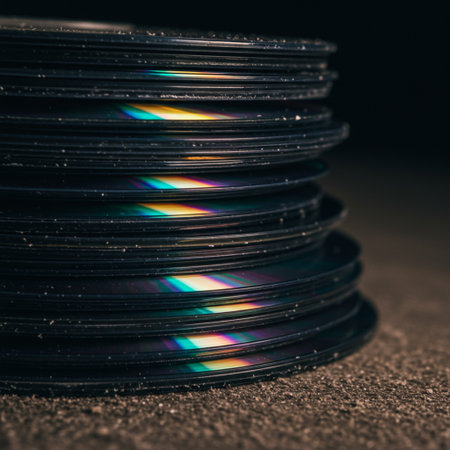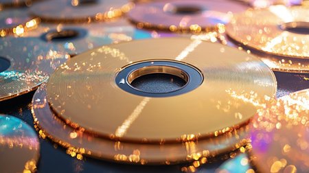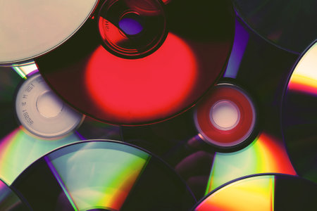 Exploring the intricate textures and reflective surfaces of compact discs in vibrant light