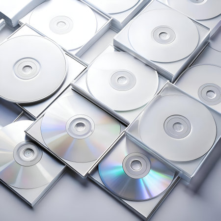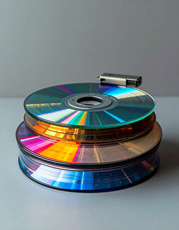 Assortment of shiny compact discs reflecting a spectrum of colors in a pattern, symbolizing data storage AI