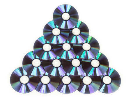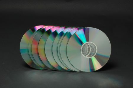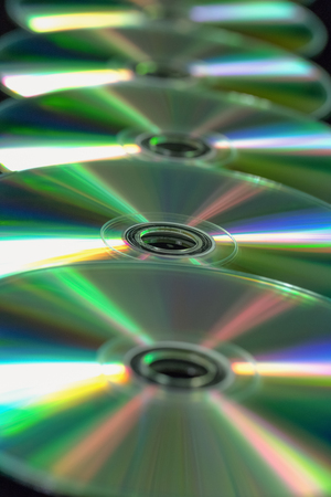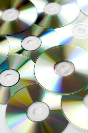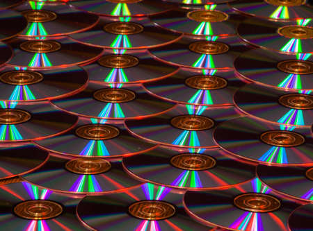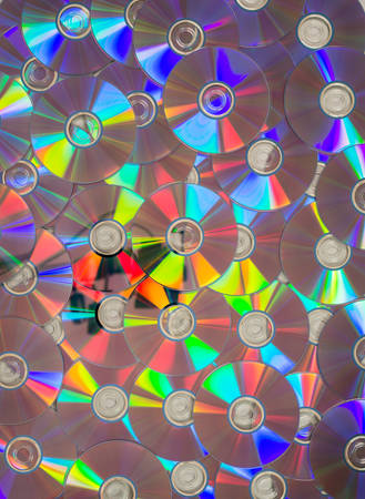 Dozens of CDs or DVDs laid flat for abstract or backgrounds.