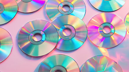 Flat lay of multiple CDs with vivid iridescent reflections spread across a pastel background