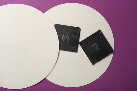 A vintage vinyl record, a floppy disk and modern media are lying next to each other. There is a place for text in the photo