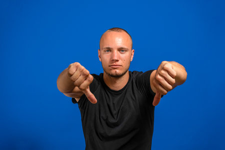 Dislike gesture. Disapproval sign. Offer rejection. Bad advertising. Skeptic man showing thumb down on blue empty space banner background.