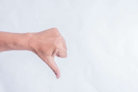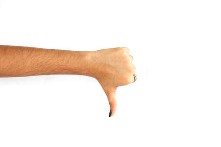 Thumb down hand signs isolated on white. black man hand gesturing with hand on white