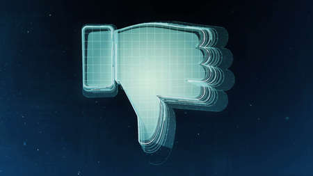 Composite of illuminated digital red dislike button icon against gray wall, copy space. Thumbs down, social media, negative emotion, hand, symbol and feedback concept.