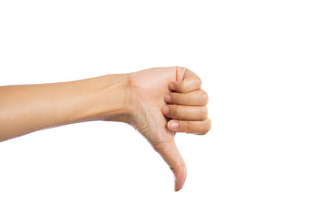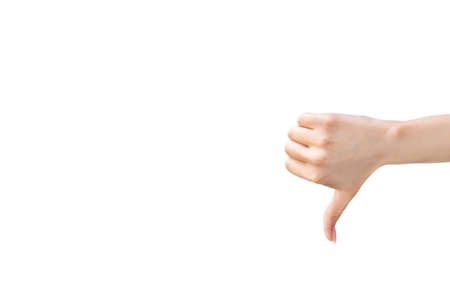 Woman's hand gesturing thumbs down. White background with copy space for your design